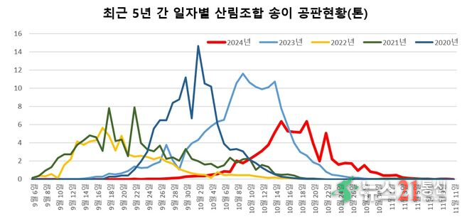 송이버섯 생산량은 기후변화와 소나무림 피해로 감소 추세를 보여왔으며, 특히 올해는 송이버섯 주산지인 경북지역의 대규모 산불 피해로 송이버섯 생산량이 감소할 것으로 예측했다.