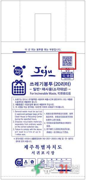 강명균 서귀포시 청정환경국장은 “이번 20L 봉투 보급을 시작으로 올해 말까지 5L, 10L, 30L, 50L 전 용량 가연성 봉투에 QR코드를 인쇄해 종량제 봉투 종합관리체계를 내실화하겠다”고 말했다.