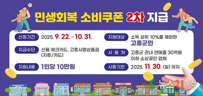 2차 지급분은 소득 상위 10%를 제외한 모든 고흥군민에게 10만 원이 지급되며, 신청 기간은 9월 22일부터 10월 31일까지다. 1차와 동일하게 신용·체크카드 및 선불카드, 고흥사랑상품권 중 하나를 선택해 받을 수 있다.