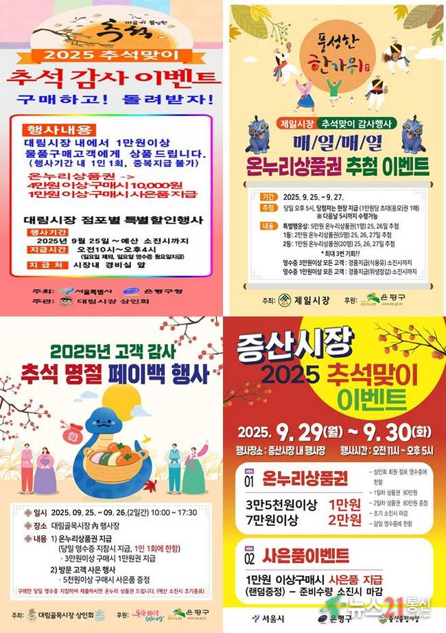 서울 은평구(구청장 김미경)는 오는 25일부터 10월 13일까지 관내 전통시장에서 추석맞이 특별 이벤트를 진행한다고 24일 밝혔다.