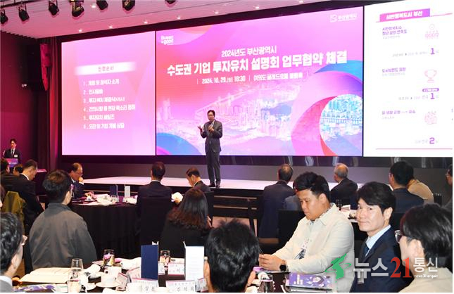 이번 설명회는 부산의 산업 경쟁력과 투자 특전(인센티브)을 알리고, 수도권 기업들의 투자 유치를 위해 마련됐다. 행사는 투자양해각서(MOU) 체결을 시작으로 ▲비즈니스 친화적 환경 소개 ▲전국 최대 규모의 기업 지원제도 안내 ▲투자 최적화 산업단지 홍보 ▲시장 주재 기업인 간담회 등으로 이어졌다.