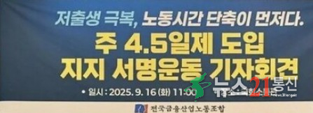 [뉴스21 통신=추현욱 ] 전국금융산업노동조합(이하 금융노조)이 주 4.5일제 도입 등을 요구하며 26일 하루 총파업에 나선다. 이재명 정부가 국정과제로 주 4.5일제를 추진하는 상황에서, 과거 노사 합의를 통해 선제적으로 주 5일제를 도입한 금융권이 이번에도 주 4.5일제 시행에 물꼬를 틀지 주목된다.
