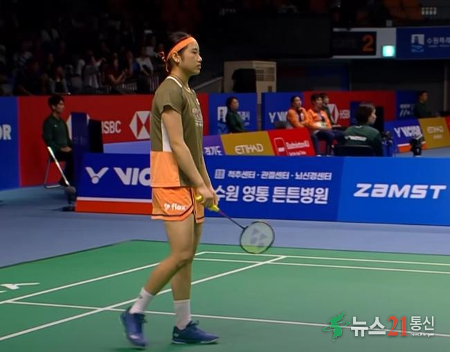 세계랭킹 1위 안세영은 25일 경기도 수원체육관에서 열린 2025 세계배드민턴연맹(BWF) 월드투어 슈퍼 500 코리아오픈 여자단식 16강에서 대만의 주빈젠(24위)을 2-0(21-13 21-8)으로 제압했다. [사진=SBS뉴스영상캡쳐]