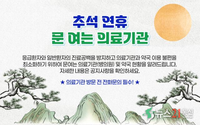 보건소는 연휴 기간인 오는 10월 3일부터 7일간 오전 9시부터 오후 6시까지 '비상 진료 대책 상황실'을 운영하며, 응급·당직 의료기관 및 휴일 지킴이 약국의 운영 여부를 점검하고, 구민들이 의료기관과 약국을 손쉽게 이용할 수 있도록 관련 정보를 안내할 예정이다.