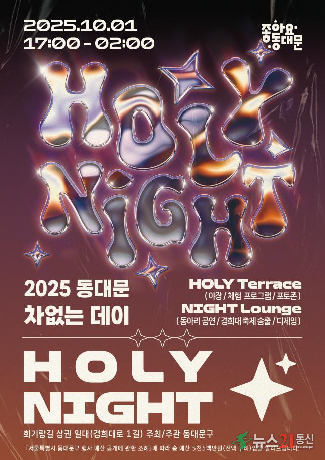 서울 동대문구(구청장 이필형)는 오는 10월 1일 오후 5시부터 다음날 오전 2시까지 회기역 인근 회기랑길(경희대로1길 및 경희대로1가길 일대)에서 ‘2025 차없는 데이-HOLY NIGHT’을 개최한다고 밝혔다.