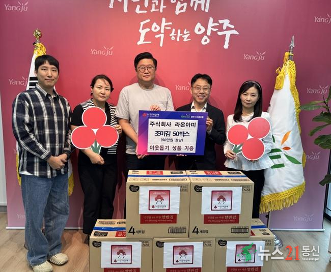 양주시 옥정2동(동장 이윤규)이 최근 ㈜라온아띠(대표 강세구)에서 추석 명절을 맞아 복지 사각지대에 놓인 이웃을 돕기 위해 조미김 50박스를 기부했다고 밝혔다.