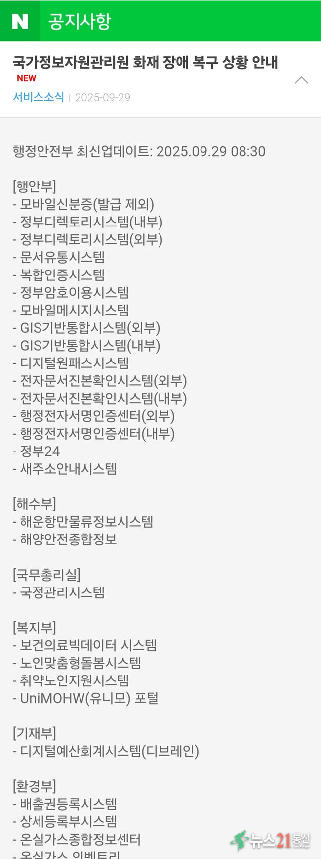 국가정보자원관리원 화재 장애 복구 상황 안내