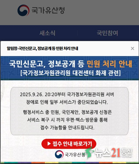다만, 국가유산청 누리집 내 국민신문고(국민권익위원회) 접속 오류에 대해 알림창(팝업)을 통해 관련 상황과 대체 수단을 계속 공지하고 있으며, 해당 서비스가 정상화 될 때까지 국가유산청 소관 민원, 국민제안, 정보공개 신청은 우편, 팩스, 방문을 통해 접수를 받고 있다.
