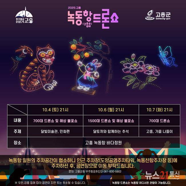 고흥군 녹동항 드론쇼는 오는 10월 25일 폐막식을 앞두고 있으며 강우, 강풍 등 기상 여건에 따라 일정이 변경될 수 있다.