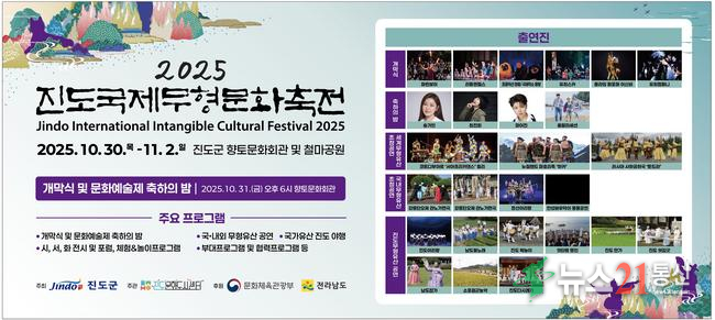 [뉴스21 통신=박철희 ]전통과 현대, 지역과 세계가 어우러지는 ‘2025 진도국제무형문화축전’이 오는 10월 30일부터 11월 2일까지 진도군 일원에서 개최된다. 이번 축전은 국내외 유명 가수들의 공연과 함께 진도에서 처음 선보이는 다양한 프로그램으로 관람객들의 기대를 모으고 있다.축전의 주무대는 향토문화회관 야외광장 특설무대...