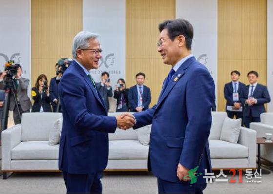 )에서 젠슨 황 엔비디아 최고경영자(CEO)와 만나 악수하고 있다. 대통령실 제공 [뉴스21 통신=추현욱 ] 엔비디아가 한국 정부와 삼성전자, SK그룹, 현대자동차, 네이버 4개 기업에 인공지능(AI) 개발에 필수적인 그래픽처리장치(GPU) 26만 장을 공급한다. 세계적 AI 투자 열풍 속에 품귀 현상을 빚는 GPU를 한국에 최우선으로 배정하는 '빅딜'이.