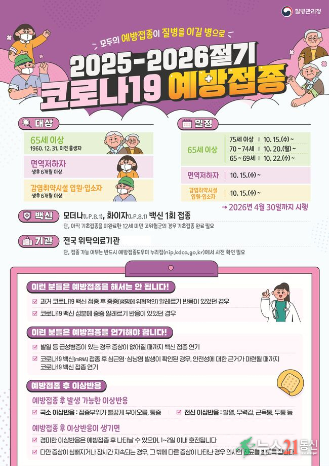 이번 접종은 연령과 대상별로 순차적으로 진행된다. 면역저하자와 감염취약시설 입원·입소자는 10월 15일부터 접종을 시작하며, △75세 이상은 10월 15일 △70~74세는 10월 20일 △65~69세는 10월 22일부터 각각 순차적으로 접종이 가능하다.