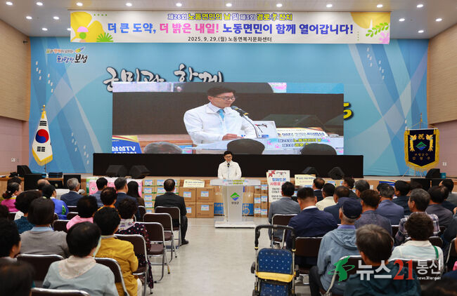 지난 9월 29일 노동면복지문화센터에서 열린 ‘제26회 노동면민의 날 및 제3회 경로효잔치’가 면민 400여 명이 참여한 가운데 성황리에 개최되며, 세대가 어우러지는 뜻깊은 화합의 장이 마련됐다.