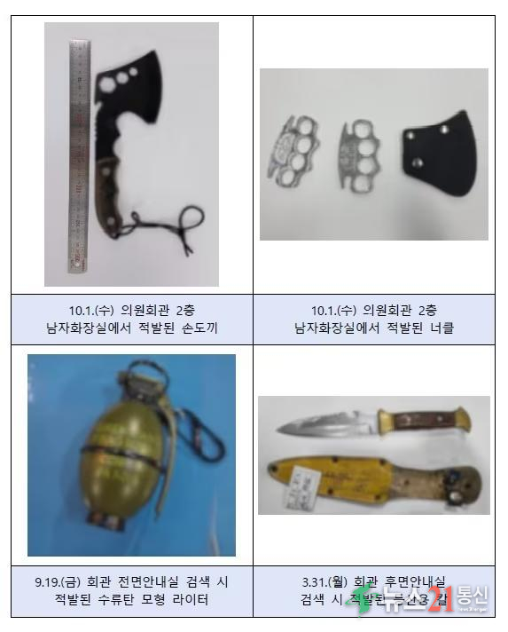 발견 경위에 따르면, 손도끼는 1일 새벽 청소 근로자가 화장실 양변기 뒤편에서 발견했고, 이어 의회방호담당관실이 청사 내 화장실 전체를 수색하는 과정에서 동일 화장실 인근 칸에서 금속 너클 2개가 추가로 나왔습니다.