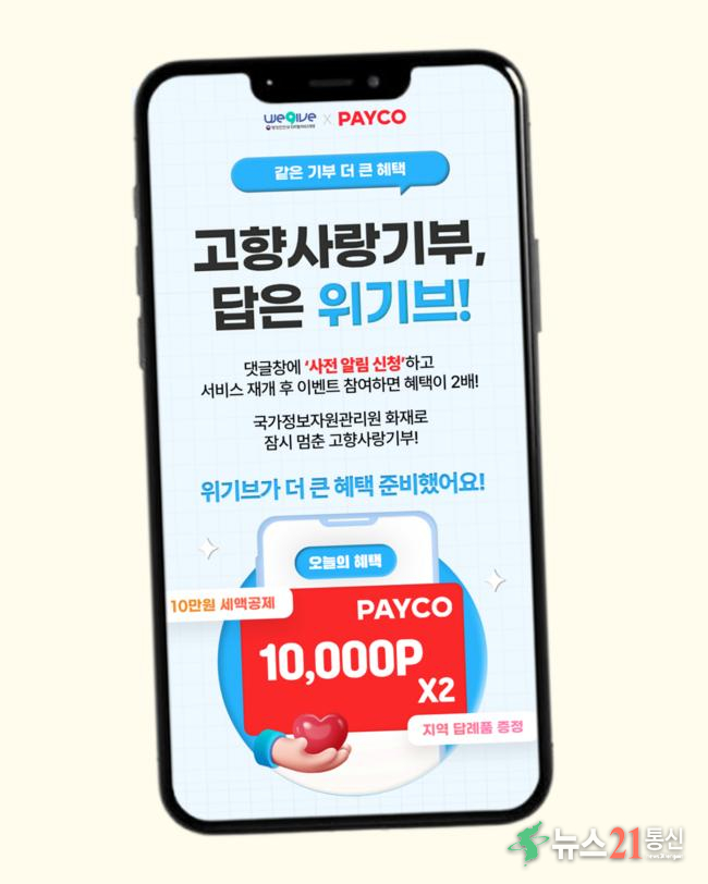 이번 이벤트는 국가정보자원관리원 화재로 고향사랑기부 서비스가 일시적으로 중단된 상황에서 기부자들의 참여 의지를 이어가기 위해 마련됐다. 기부 서비스가 정상화되기 전에 사전 예약을 접수하며, 참여자에게는 답례품 제공 및 세액공제와 함께 페이코 2만 포인트가 추가로 제공된다.