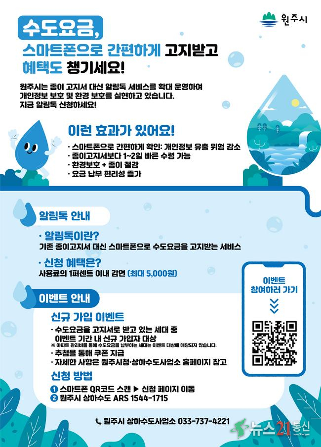 원주시상하수도사업소는 ‘수도요금 알림톡 서비스’ 확대를 위해 10월 1일부터 12월 7일까지 신규 가입 이벤트를 진행한다.