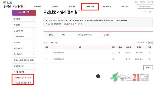 충남도는 2일부터 도 누리집에 ‘국민신문고 온라인 임시 접수 창구’를 개설・운영하고 있다고 밝혔다.