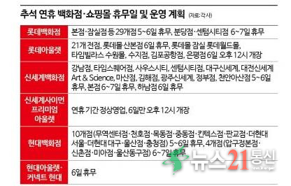 [뉴스21 통신=추현욱 ] 최장 10일간 이어지는 추석 연휴 기간, 가족 단위 쇼핑이나 먹거리 장보기 등을 위해 백화점과 쇼핑몰, 대형마트 등을 찾는 소비자들이 적지 않을 것으로 예상된다. 연휴 기간 점포별로 문을 열지 않거나 일자별로 영업시간을 단축하는 곳이 있어 사전에 일정을 확인해야 한다.