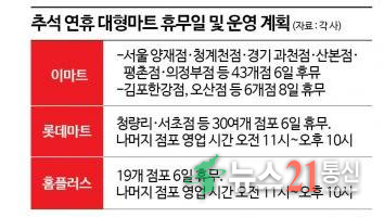 홈플러스와 롯데마트는 추석 당일인 6일에 각각 19개점과 30여개점만 문을 닫는다. 나머지 점포는 오전 10시~오후 11시인 기존 영업 시간을 오전 11시부터 오후 10시까지로 변경한다. 의무휴업일인 12일에는 홈플러스와 롯데마트 대다수 점포가 문을 열지 않는다.