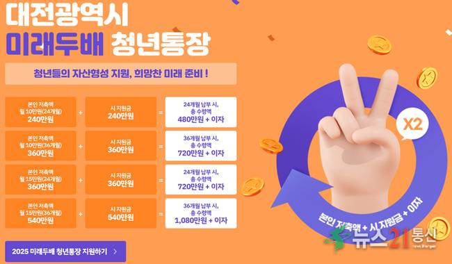 대전시는 지역에서 성실히 일하는 근로 청년들의 자산 형성을 지원하기 위해 ‘미래두배 청년통장’ 신청자를 오는 10월 20일부터 31일까지 모집한다고 9일 밝혔다.