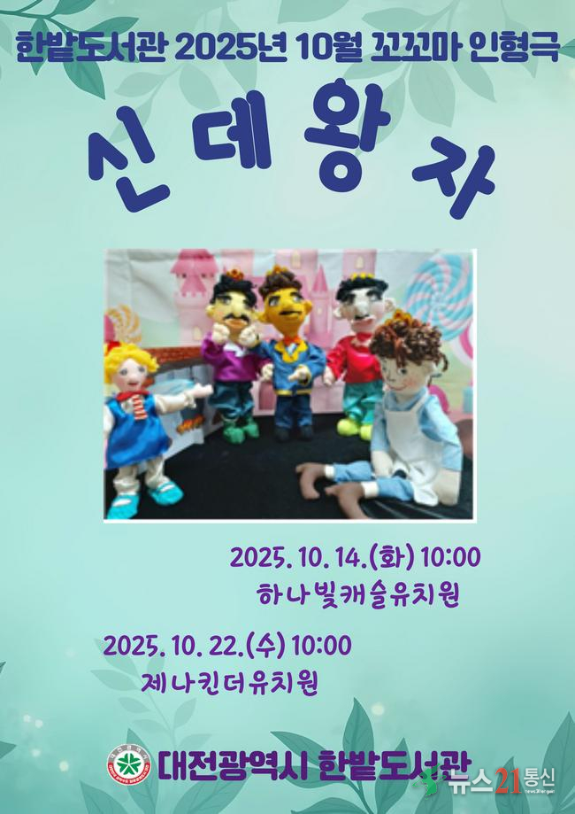 대전 한밭도서관은 어린이의 감정 표현과 상상력을 키우기 위해 유치원을 직접 찾아가는 독서문화 프로그램으로 손인형극 ‘신데왕자’를 공연한다. 이번 손인형극은 10월 14일 중구 하나빛캐슬유치원, 10월 22일 서구 제나킨더유치원을 찾아 아이들과 만날 예정이다.