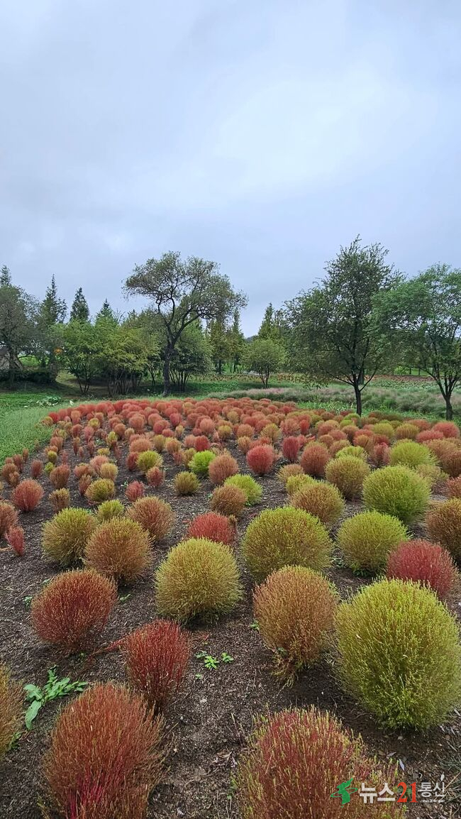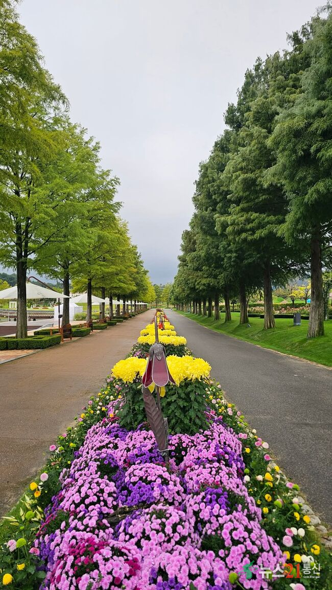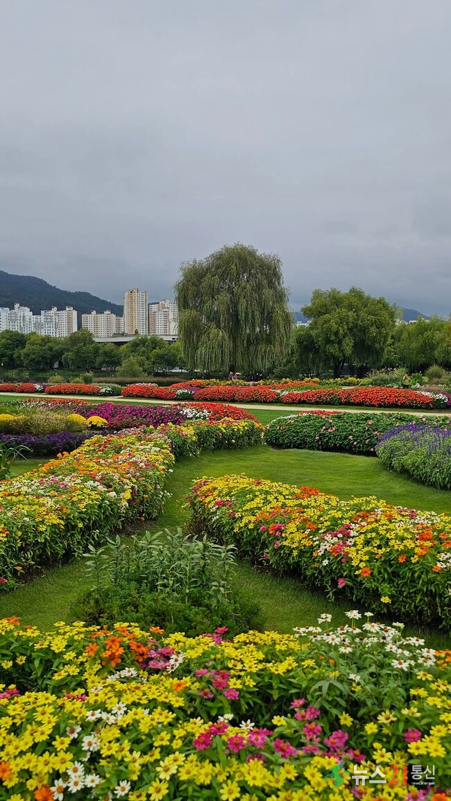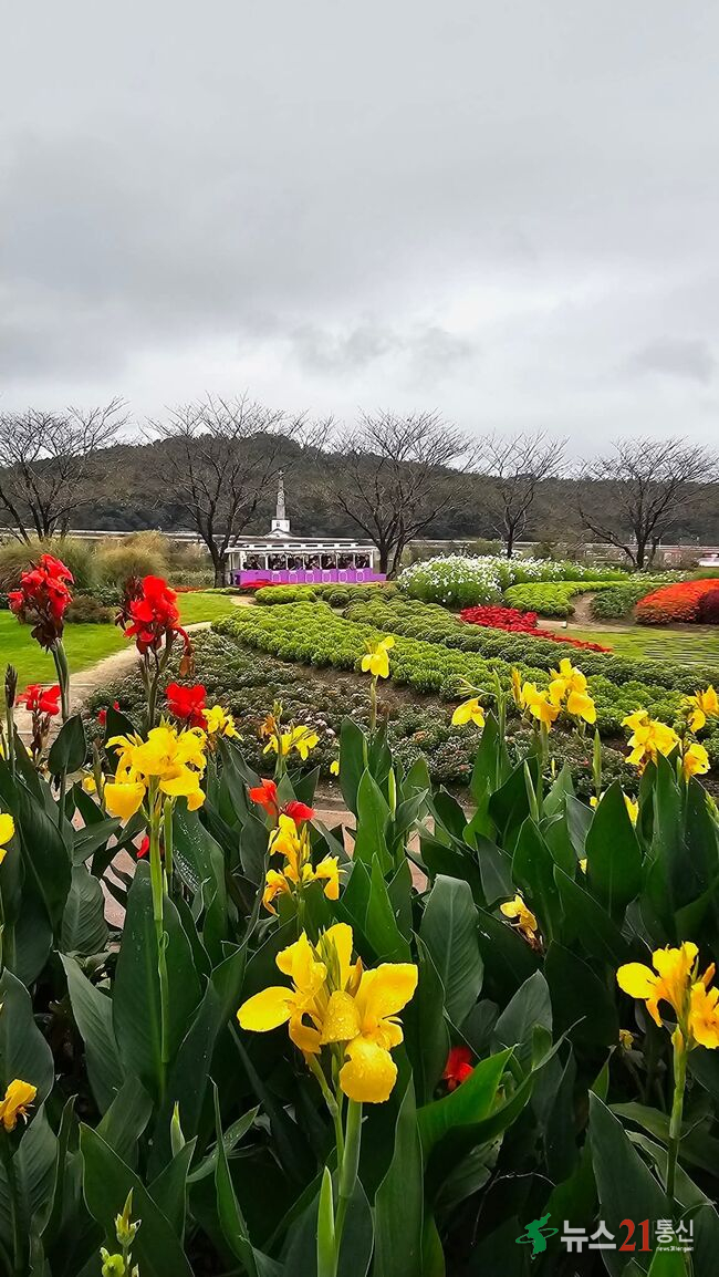 멀리 보이는 산과 도시의 풍경을 배경으로, 정원 속 꽃들은 계절의 변화를 가장 먼저 알리듯 활짝 피어나 있다. 초록빛 잔디 위에 놓인 꽃의 파도는 자연과 사람을 이어주는 다리처럼 느껴지며, 그 속을 거닐다 보면 일상의 무게가 잠시 내려앉고 마음이 환히 열리는 경험을 선사한다.