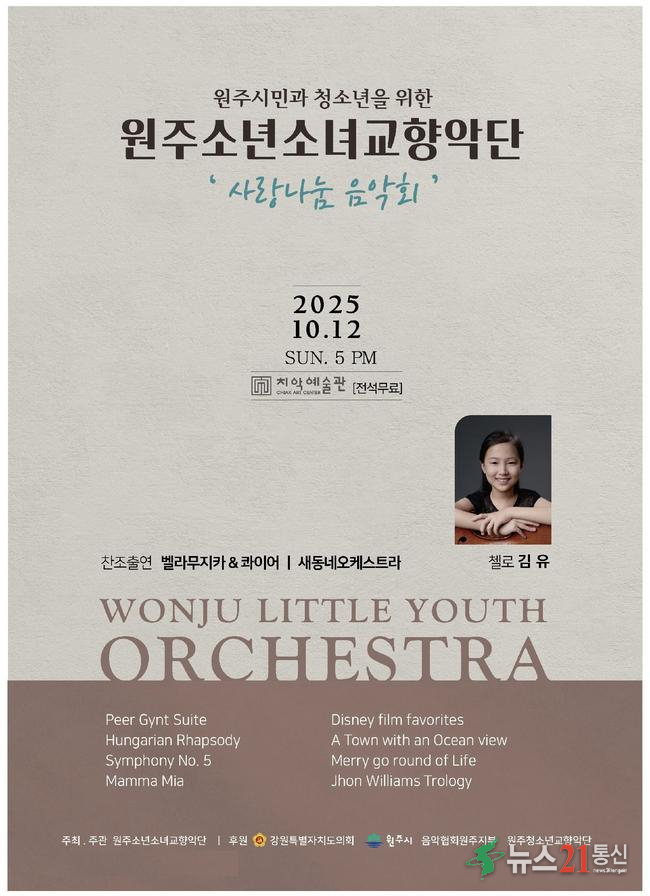 원주소년소녀교향악단은 오는 12일 오후 5시, 치악예술관에서 ‘사랑나눔음악회’를 통해 지역사회와 함께하는 따뜻한 무대를 마련한다.