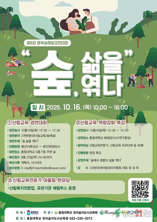 이번 숲해설 경연대회는 충북도가 주최하고, 산림교육전문가 양성기관(충청대학교 유아숲지도사교육원, 충북숲해설가협회, 숲환경교육센터)이 공동 주관해 도민들의 참여와 관심을 유도하고자 ‘숲, 삶을 엮다’라는 주제로 숲과 사람, 지역이 함께 어우러지는 숲 문화 축제로 펼쳐진다.
