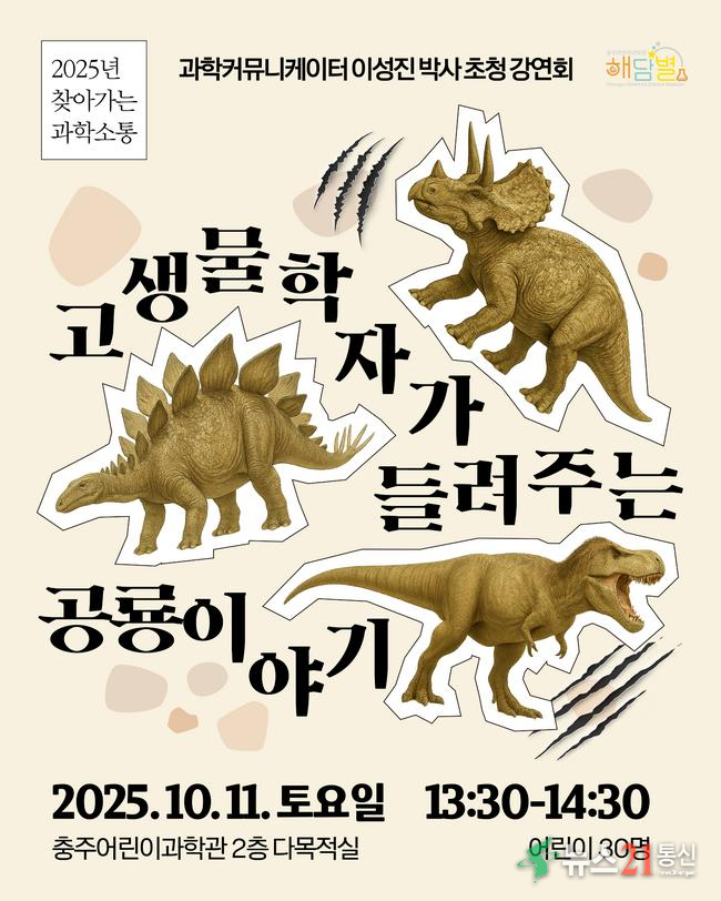 충주어린이과학관은 오는 10월 11일(토요일), 과학커뮤니케이터로 활동 중인 고생물학자 이성진 박사를 초청해 초등 저학년 어린이를 위한 특별 강연 ‘고생물학자가 들려주는 공룡 이야기’를 개최한다고 밝혔다.