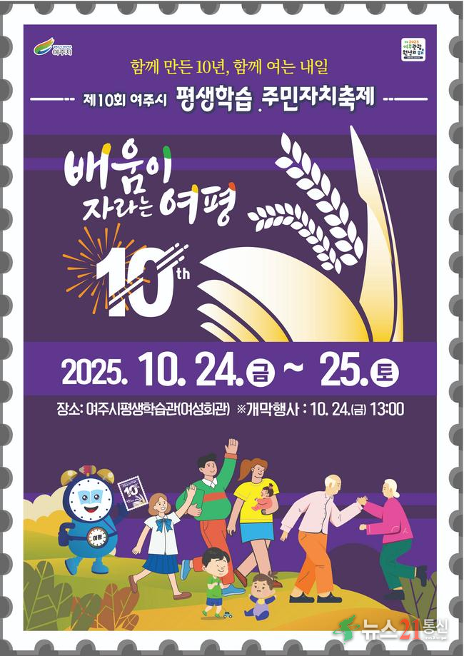 여주시(시장 이충우)는 오는 10월 24일(금)부터 25일(토)까지 이틀간 여주시평생학습관 일원에서 「제10회 여주시 평생학습·주민자치축제」를 개최한다. 「배움이 자라는 여평 – 함께 만든 10년, 함께 여는 내일」을 주제로 열리는 이번 축제는 평생학습도시 여주시가 지난 10년간 시민과 함께 쌓아온 학습의 성과를 나누고, 앞으로의 10년을 새롭게 열어가는 의미 있는 자리로 마련됐다.