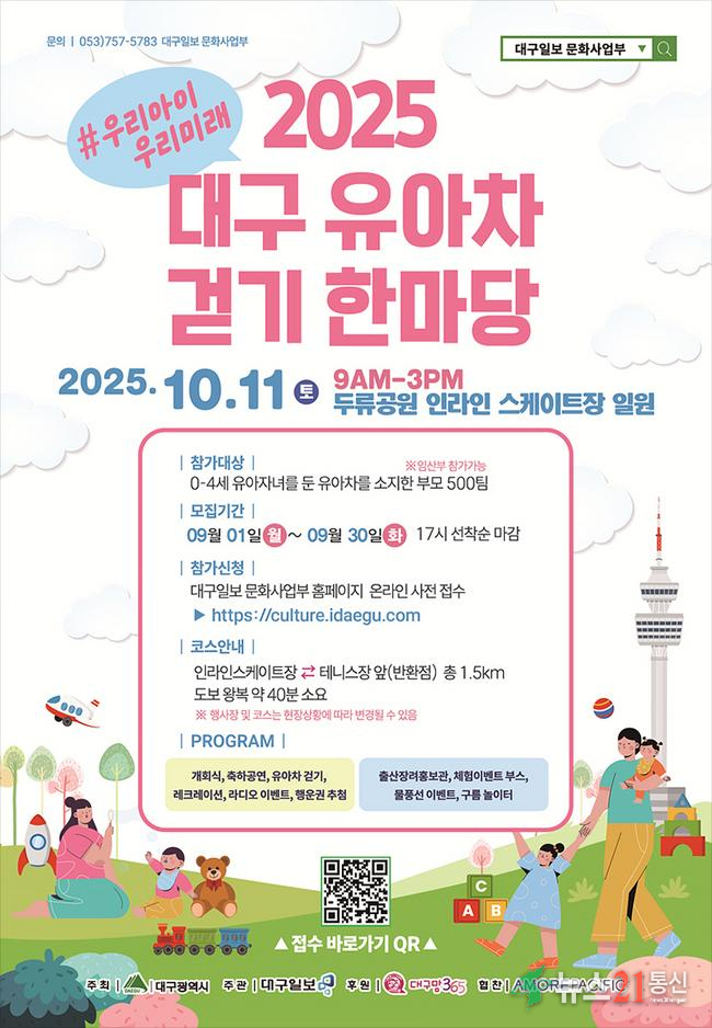 대구광역시는 저출생에 대한 관심을 높이고 가족의 소중함을 되새기기 위해 10월 11일(토) 두류공원 인라인스케이트장에서 ‘2025년 제12회 유아차 걷기 한마당’을 개최한다.