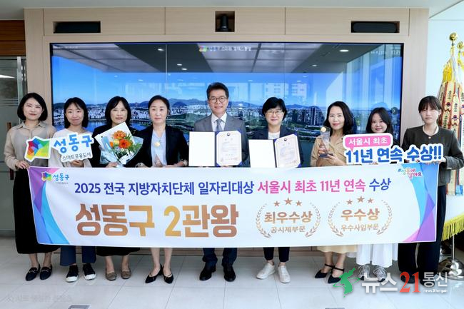 서울 성동구(구청장 정원오)가 ‘2025년 전국 지방자치단체 일자리대상’에서 공시제 부문 ‘최우수상’과 우수사업 부문 ‘우수상’을 수상하며 2관왕 달성과 동시에 2015년부터 11년 연속 수상이라는 대기록을 세웠다고 밝혔다.