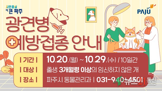 시는 하반기 광견병 예방사업을 위해 예방백신 4,500마리 분을 무상 지원하며, 예방접종을 희망하는 반려견 보호자는 33개 지정 동물병원을 방문해 시술비 1만 원만 부담하면 접종이 가능하다. 참여 동물병원 목록은 파주시청 누리집 공고문을 통해 확인할 수 있다.