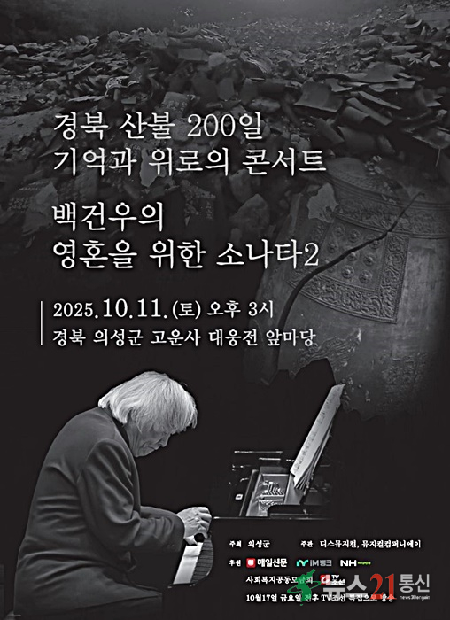 의성군(군수 김주수)은 경북 산불 발생 200일을 맞아 세계적인 피아니스트 백건우의 위로 연주회가 오는 10월 11일 토요일 오후 3시, 의성군 천년고찰 고운사에서 열린다고 밝혔다.