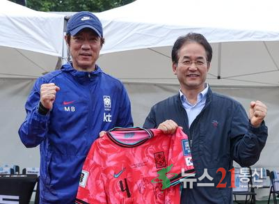 국가대표팀 선수들의 친필 사인 유니폼을 들고 기념촬영 중인 이동환 고양특례시장(오른쪽)과 홍명보 축구 국가대표팀 감독. 고양시 제공