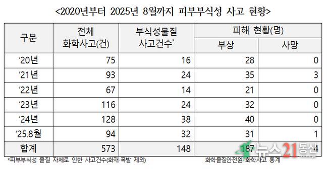 최근 6년간 피부부식성 화학물질로 인한 사고가 총 148건 발생해 191명의 피해자가 발생했고, 이 중 4명이 사망한 것으로 나타났다.