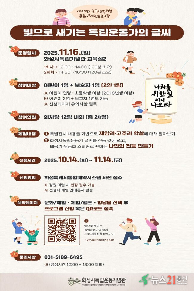 한동민 화성시독립운동기념관장은 “이번 프로그램이 순국선열의 희생과 정신을 직접 체험하며 되새길 수 있는 소중한 기회가 될 것”이라며 “가족이 함께 독립운동의 역사적 의미를 공유하고 평화의 가치를 나누는 시간을 가져보시길 바란다”고 말했다.