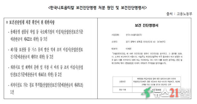 한국니토옵티칼은 지난 10년간 산업안전보건 감독에서도 다수의 위반 사항이 적발됐다. 2015년부터 2025년까지 ‘관리대상 유해물질 정보 미게시’, ‘관리감독자 직무 미이행’, ‘공정안전보고서 미준수’ 등으로 8건의 시정조치를 받은 것으로 확인됐다.