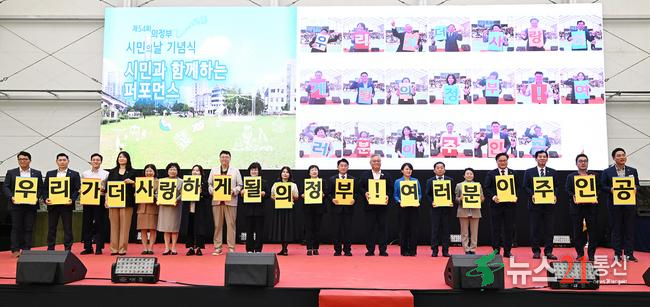 이어진 ‘시민과 함께하는 특별 설정극(퍼포먼스)’에서는 김동근 시장을 비롯한 내빈들이 ‘우리가 더 사랑하게 될 의정부, 여러분이 주인공’이라는 문구가 적힌 팻말(피켓)을 들고, 시민들과 함께 무대에 올라 하나 된 모습을 연출했다. 이 장면은 대형 화면을 통해 실시간으로 중계되며 현장을 감동으로 물들였다.