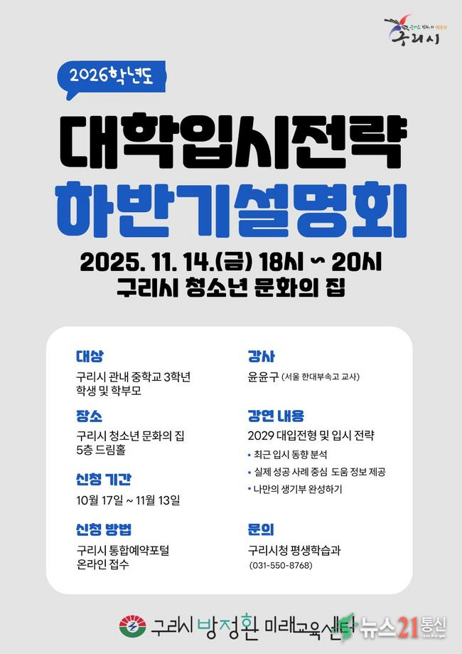 구리시(시장 백경현)는 ‘2026학년도 대학입시 전략 하반기 설명회’ 참석자를 오는 10월 17일부터 구리시 통합예약 포털을 통해 선착순 110명까지 신청받는다고 밝혔다.