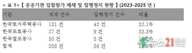 복 의원이 한국토지주택공사(LH), 한국도로공사, 한국철도공사로부터 제출받은 자료에 따르면, 최근 3년간(2023~2025년) 세 기관의 입찰참가자격 제재 208건 중 56건(26.9%)이 법원에 의해 집행정지된 것으로 확인됐다.