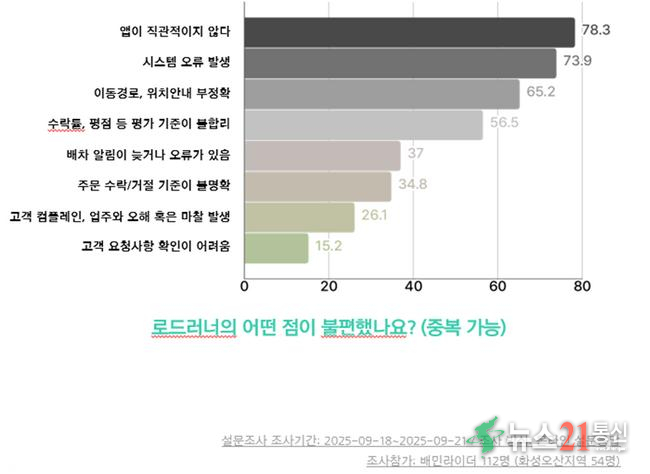 한 의원에 따르면 우아한형제들은 기존 자사 시스템인 ‘배민커넥트’를 대체해 독일 본사 앱인 로드러너를 전국적으로 확대 적용하려 하고 있다. 현재 오산·동탄 지역에서 시범운영 중인 로드러너는 지도 오류, 정산 지연 등으로 현장 라이더와 가맹점주들의 불만이 커지고 있다. 거리 제한 기능이 일방적으로 적용되면서 일부 가게는 영업 중에도 주문 목록에서 사라지고, 고객은 원하는 매장을 선택할 수 없어 매출과 소비자 선택권이 동시에 침해되는 사례가 발생하고 있다.