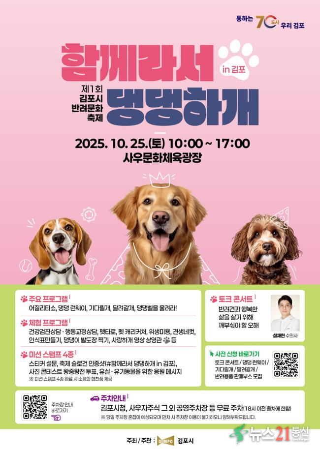 김포시는(시장 김병수)는 반려동물과 시민이 함께하는 문화의 장인 제1회 김포시 반려문화축제 「함께라서 댕댕하개 in 김포」가 오는 10월 25일 사우문화체육광장(사우동)에서 개최된다고 밝혔다.