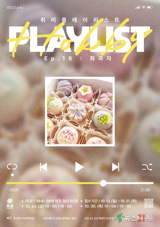 여주시청년활동지원센터는 오는 10월, 여주시 청년들의 다채로운 취미 및 문화생활 지원을 위한 「취미플레이리스트(ep.16 화과자)」 프로그램을 진행한다고 밝혔다.