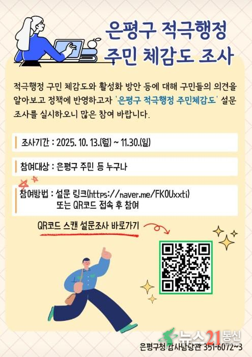 서울 은평구(구청장 김미경)는 구민이 만족하고 체감하는 적극행정을 펼치기 위해 ‘적극행정 주민체감도 설문조사’를 11월 30일까지 실시한다고 밝혔다.