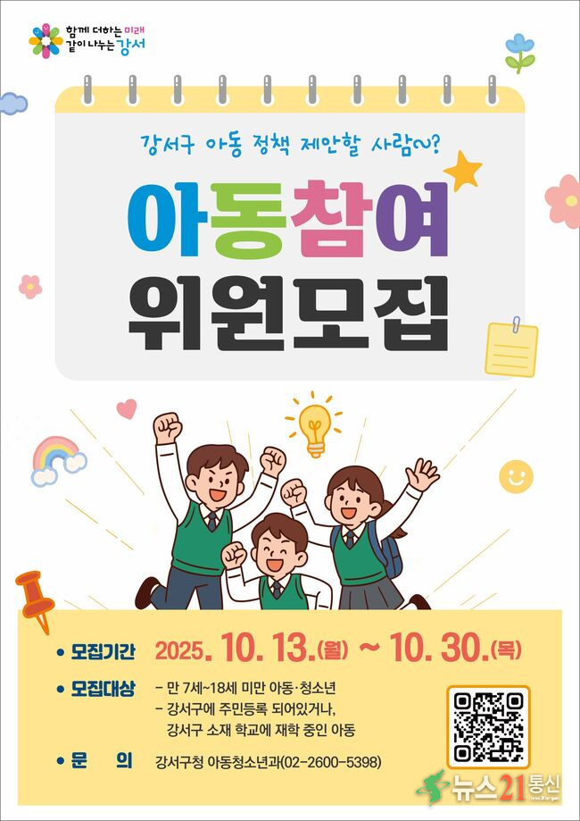 참여를 희망하는 아동은 오는 30일까지 강서구청 아동청소년과(양천로 61길 101, 가양도서관 2층)에 방문하거나, 우편 또는 전자우편(jeong777@gangseo.seoul.kr)으로 신청하면 된다.