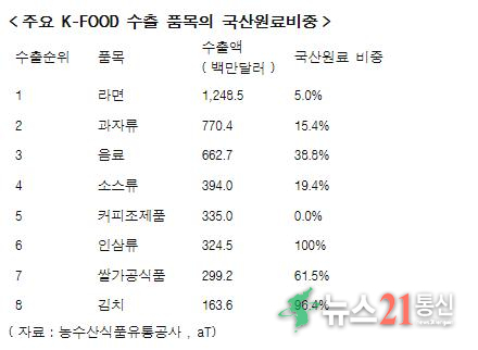 조사에 따르면 수출 1위 품목인 라면(면류)의 원료 중 95%가 수입산이며, 국산은 5%에 불과했다. 특히 밀가루의 국산 비중은 0.3%로 사실상 전량 수입에 의존하고 있다. 과자류의 국산 비중은 15.4%, 음료 38.8%, 소스류 19.4%, 커피조제품 0%, 인삼류 100%, 쌀가공식품 61.5%, 김치 96.4%로 조사됐다. 인삼류·김치·쌀가공식품을 제외한 대부분의 품목이 수입 원료에 의존하고 있는 셈이다.