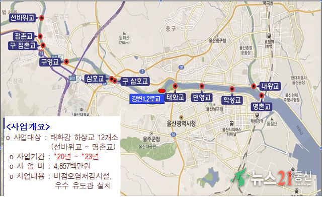 한편, ’태화강 하상교 비점오염 저감시설 설치사업‘은 울주군 범서읍(선바위교)에서 남구 삼산동(명촌교)사이 12개소에 우수유도관과 비점오염저감시설 등이 설치되어 있으며, 2023년 10월에 준공되어 운영되고 있다.