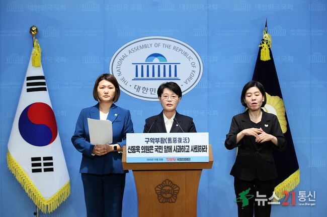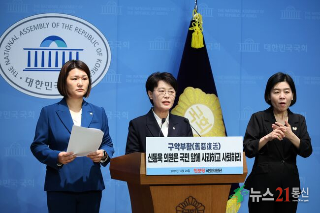 진보당 국회의원단(윤종오·전종덕·정혜경·손솔 의원)은 20일 국회 소통관에서 기자회견을 열고 “신동욱 의원은 국민 앞에 사과하고 즉각 의원직에서 사퇴해야 한다”며 강하게 비판했다. 의원단은 “이미 사라졌어야 할 낡은 정치의 유산이 다시 고개를 들고 있다”며 “허위 발언으로 동료 의원과 국민을 기만한 책임을 져야 한다”고 밝혔다.