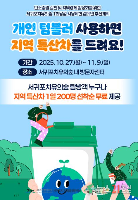 서귀포시는 관광·웰니스 명소인 서귀포치유의숲을 활용해 일회용컵 사용을 줄이고 지역경제를 활성화하기 위한 캠페인을 실시한다.이번 캠페인은 개인 텀블러를 지참한 탐방객에게 지역 특산차를 무료로 제공하는 이벤트로, 탐방객이 간단하게 친환경 실천에 참여함과 동시에 지역 특산품을 경험할 수 있도록 설계됐다.행사는 10월 27...